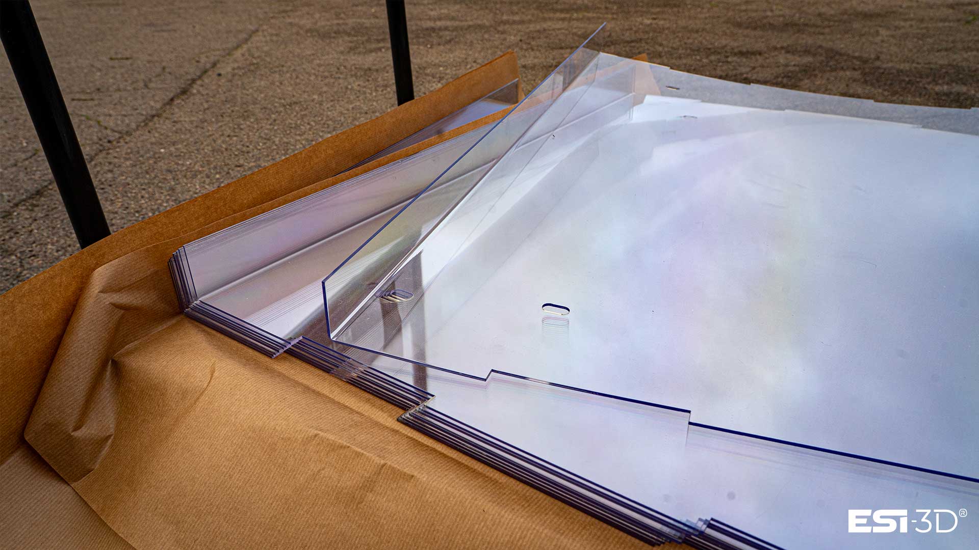 Chez ESI-3D, nous disposons d’un parc machine complet pour la découpe laser, l’usinage CNC et le pliage à chaud de matériaux tels que le plexiglass, le polycarbonate, le PET-G, le PET-A ou le PVC. Cette polyvalence nous permet d’accompagner aussi bien :