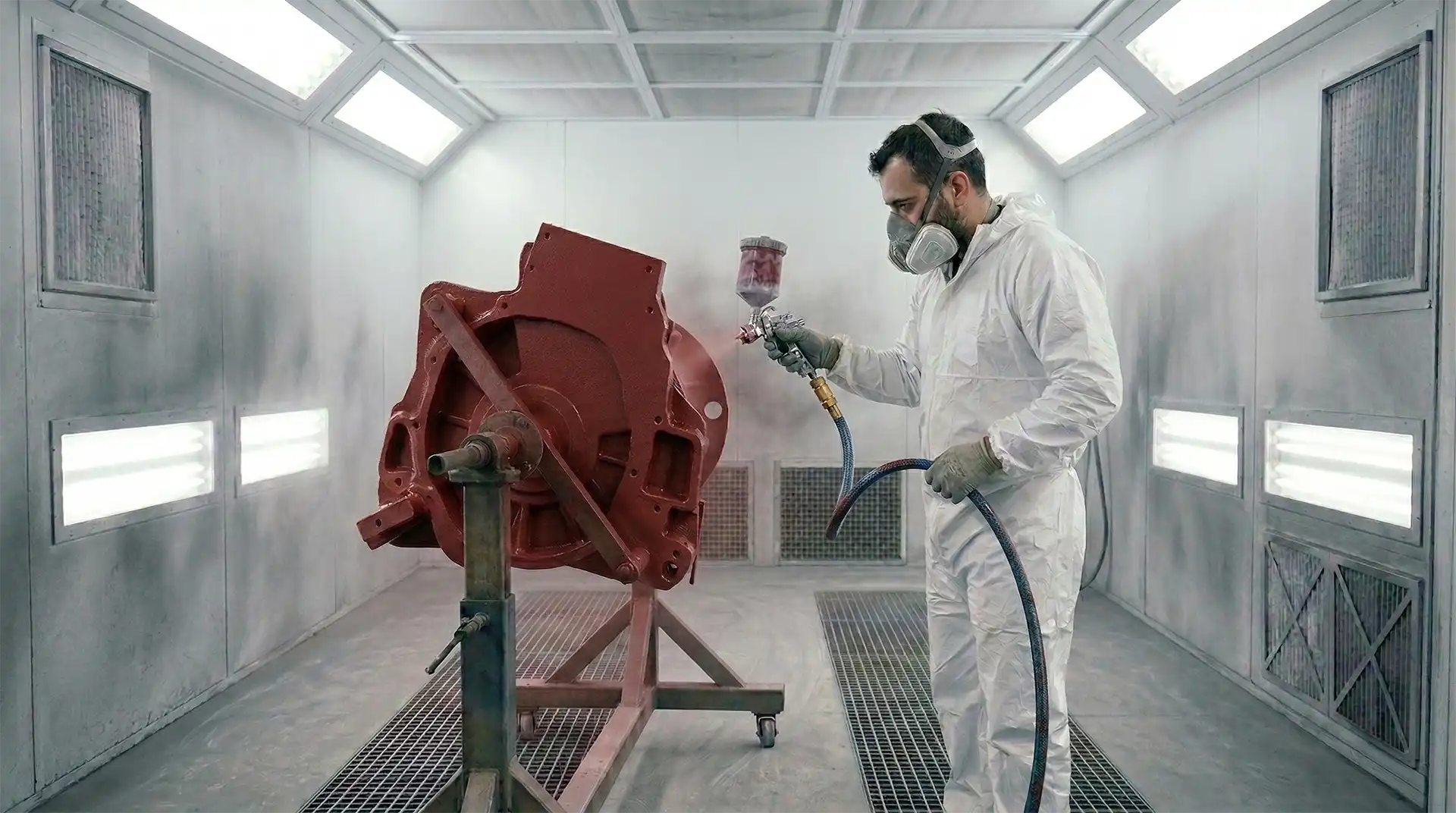 Le dépôt se fait généralement au pistolet pneumatique HVLP ou LVLP, en cabine ou en zone ventilée, afin d’obtenir une couche régulière sans surcharge. L’application s’effectue en 2 à 3 passes croisées, à une pression comprise entre 1,8 et 2,5 bars, permettant de déposer un film d’environ 80 à 120 µm, voire davantage pour les apprêts garnissants.